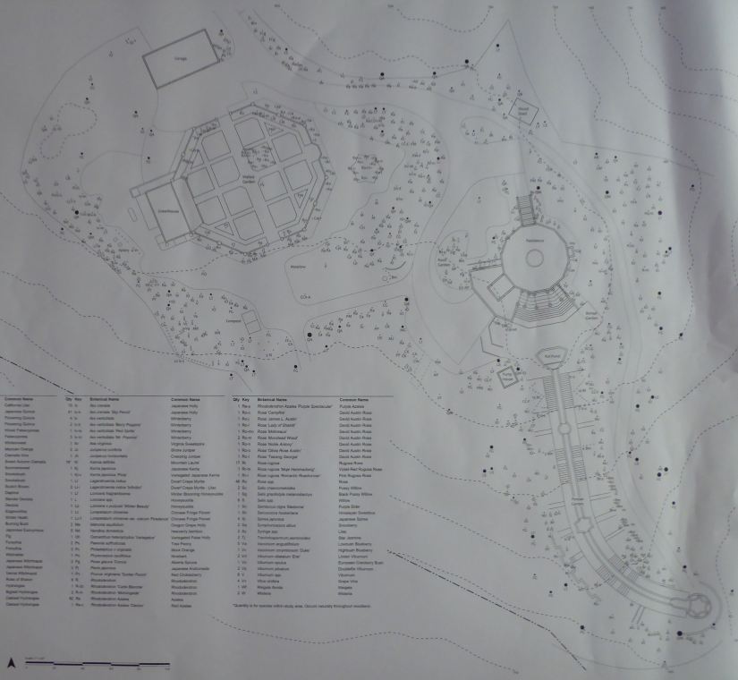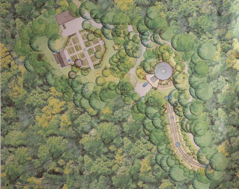 The picture on the left is a rendering of an aerial view of the house, the Persian garden (half arch with the waterfall shown) and the Walled garden (6-sided).