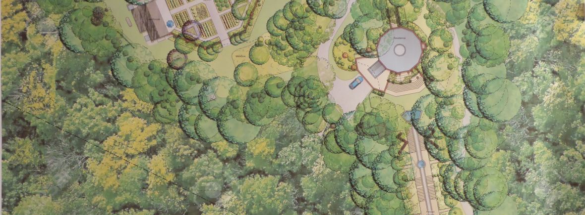The picture on the left is a rendering of an aerial view of the house, the Persian garden (half arch with the waterfall shown) and the Walled garden (6-sided).