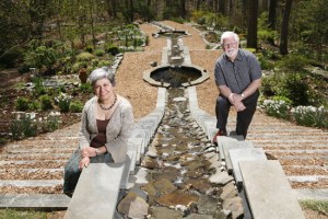 The Persian Garden is the main garden, built between 2000 and 2002. It is heavily inspired by the Shahzadeh Garden in Mahan, Iran. It is terraced into four levels, shaped to represent half of an arched window of the house. Its “walls” are 20 Jane magnolias on either side. Its length is the square of the height of the house, its width is the width of the house. Each level has a pond shaped as a twelve-sided structure to match the 12-sided house. The edges maybe cutoff to accommodate the rill that connects all the ponds and acts as a waterfall. The pond sizes follow the Fibonacci sequence (level 2= 5’, level 3= 8’, level 4 = 13’, level 1=21’). In compliance with the traditional “chahar-bag” or quadrant design of all Persian gardens, each level is divided into quadrants. It is planted with over 70 different varieties of perennials, shrubs and bulbs.
