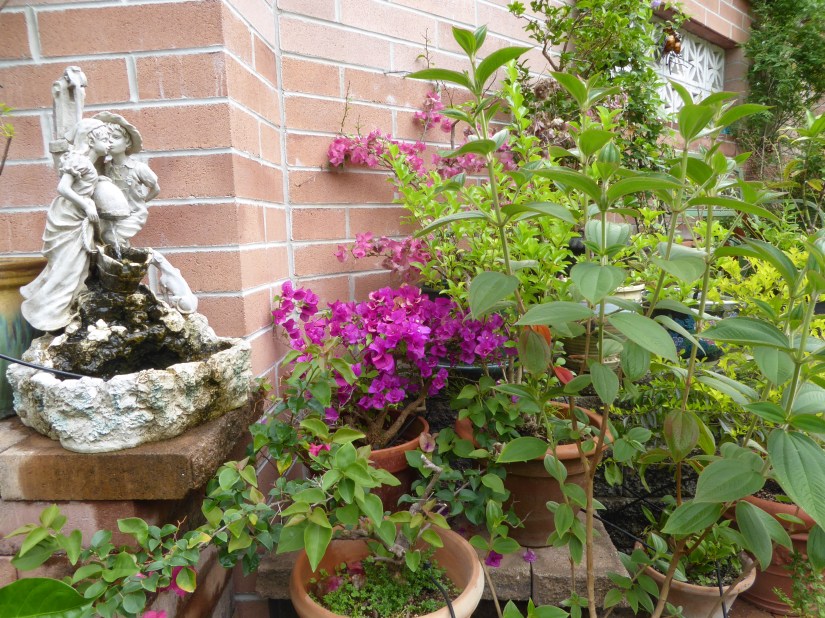 The little fountain of the kissing girl and boy tugged at by their beautiful hound was a gem found in an antique shop in South Carolina. The sound of the trickle of water adds to the calming picture. It is the favorite drinking spot for the honey bees.